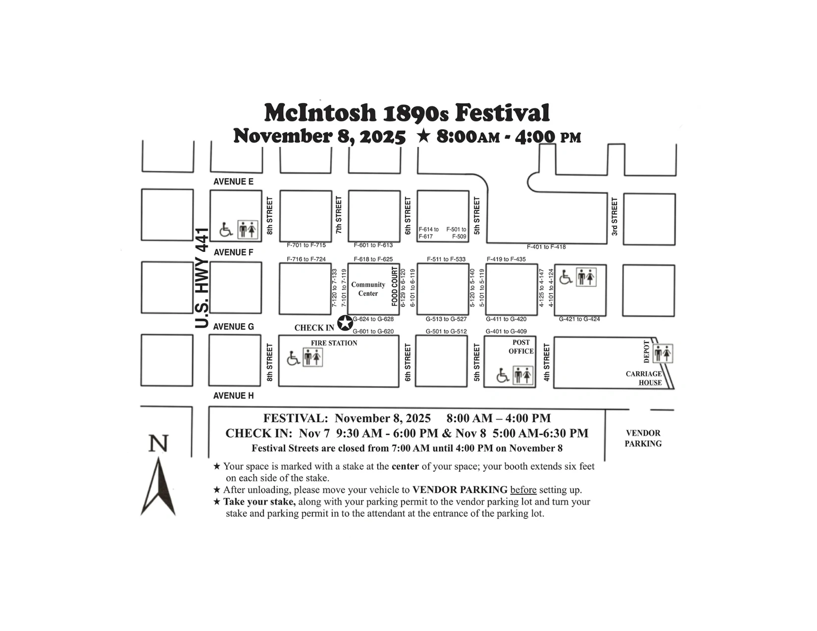 To respect festival guests and McIntosh residents alike, vendors’ products, displays, and attire must be family friendly. Booth spaces in the McIntosh 1890s Festival are adjacent to local homes, businesses, and churches.